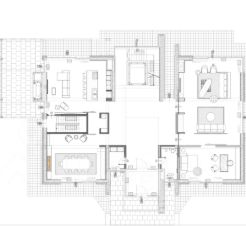 1 этаж: холл со вторым светом, гостиная, кухня-столовая, кабинет / спальня, гардеробная, гостевой с/у, кладовая, терраса.