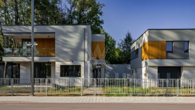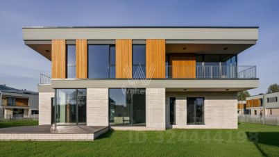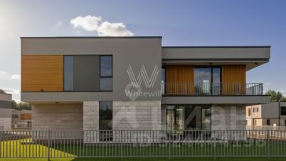 Зайцево Парк. Загородный дом площадью 363 м² построен на полевом участке 11,6 соток. Фасад выполнен в современном стиле и облицован белой штукатуркой, клинкерной плиткой и декорирован вставками под дерево. Коттедж представлен без отделки, что позволяет реализовать индивидуальный дизайн-проект. Участок с газоном окружен изгородью.