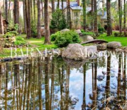 Участок лесной, ровный, правильной формы, с ландшафтными работами: газон, дорожки, освещение, пруд, декоративные насаждения.