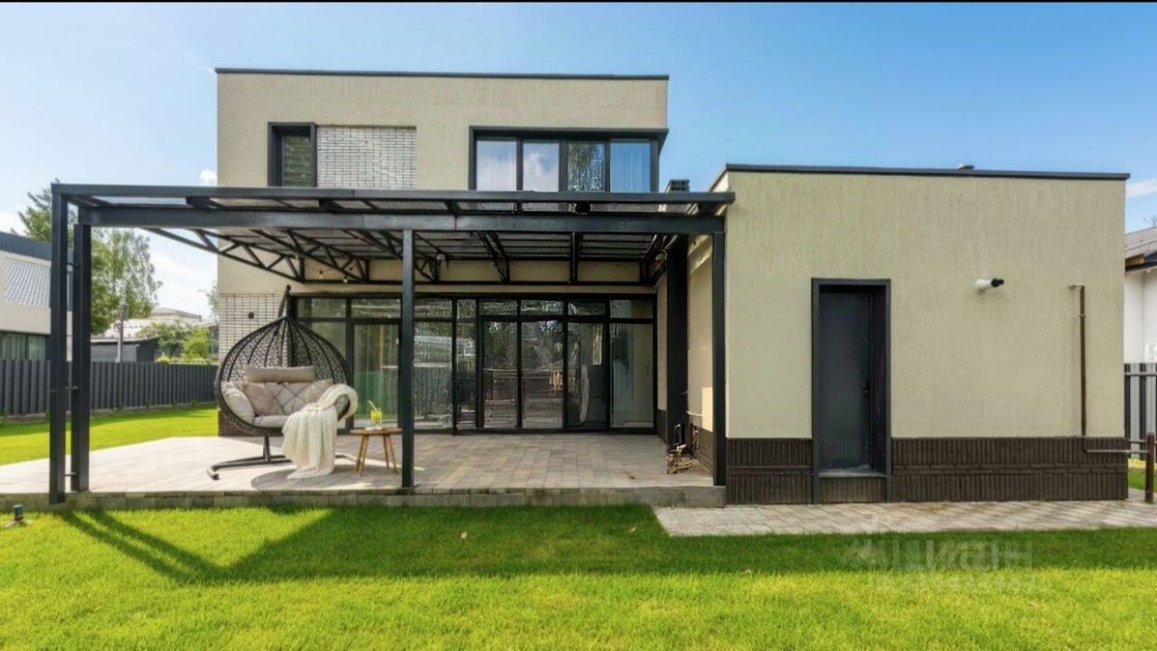 Новый загородный коттедж площадью 250,9 м² расположен на полевом участке 7 соток.