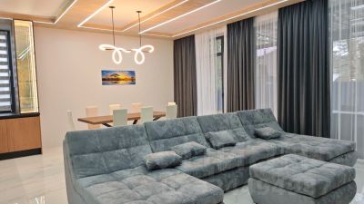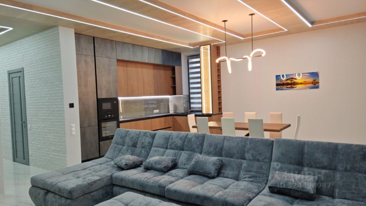 Просторная гостиная плавно переходит в функциональную кухню-столовую, создавая идеальное пространство для семейного отдыха и приема гостей.