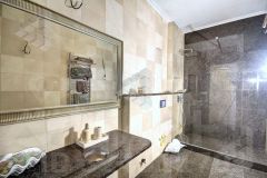 Во дворе две зоны барбекю отделаны песчаником и травертином с гранитными столешницами.