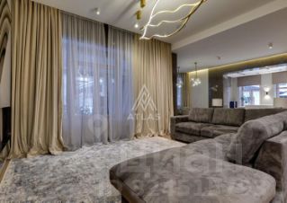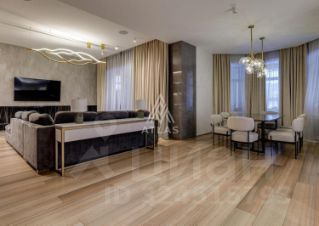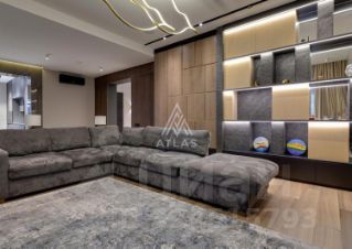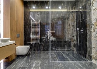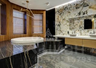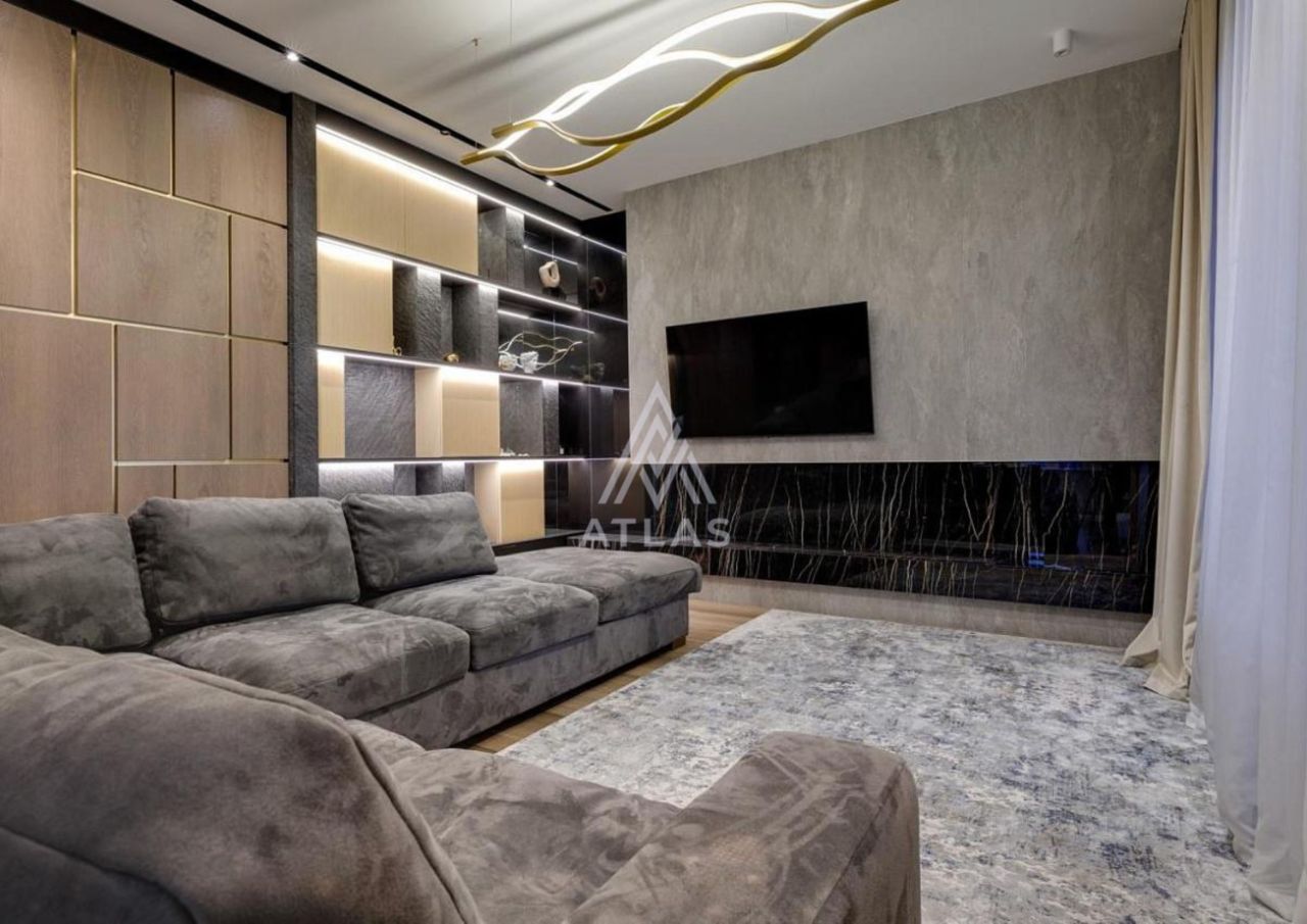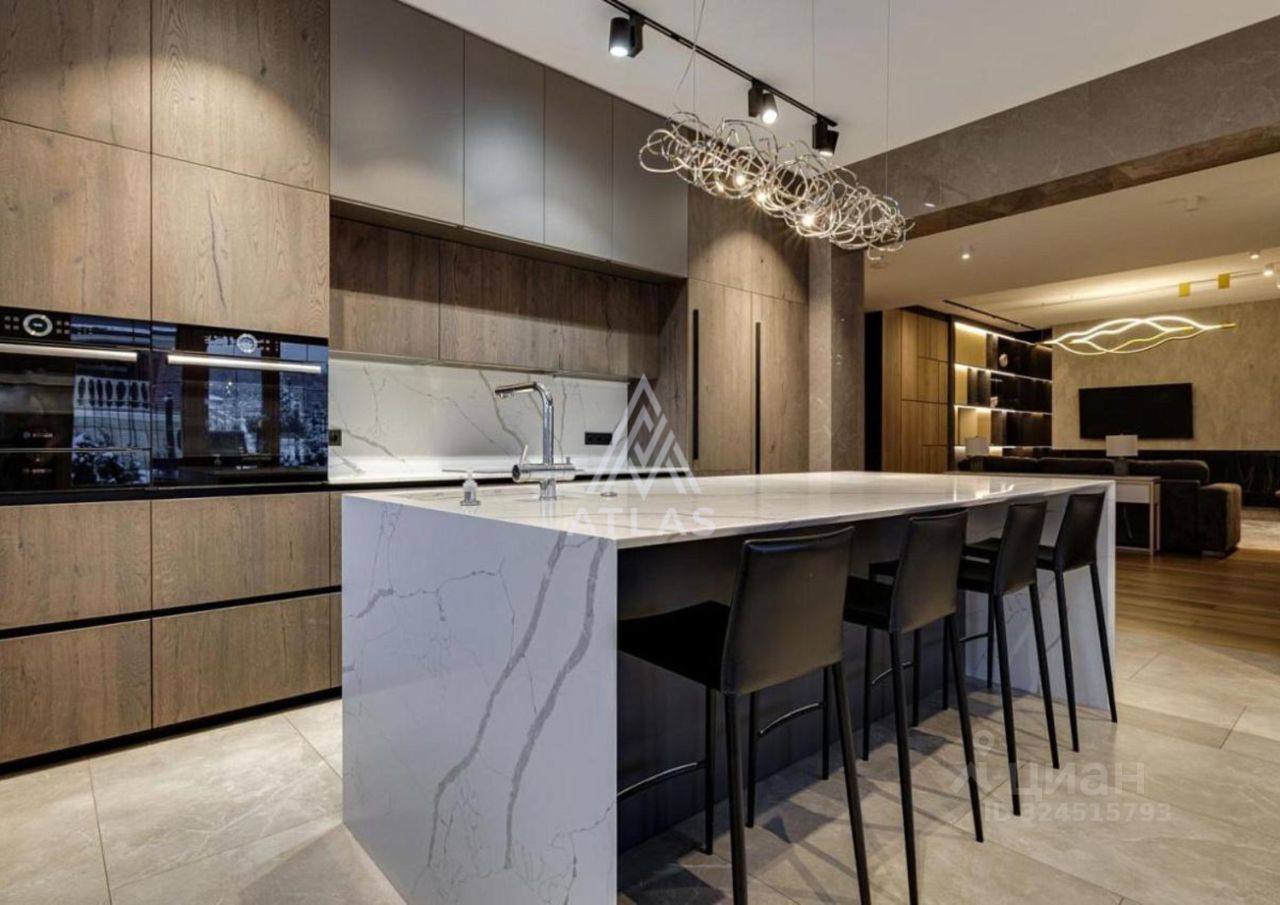Гостиная оформлена панелями и крупной каменной композицией, дополненной встроенным освещением. Кухня итальянского производства оснащена техникой Bosch; остров выполнен из крупноформатного камня.