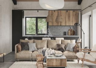 Интерьер сочетает дерево, камень и мягкие оттенки текстиля.