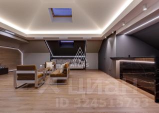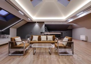 На мансарде создана отдельная зона отдыха с барной линией и мягким рассеянным светом.