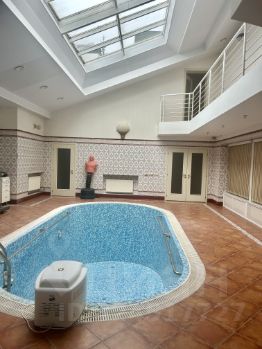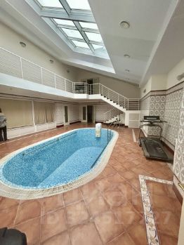 Другая половина дома полностью отведена под развлечения и разнообразный отдых- настольный теннис, бильярд, кинотеатр, бар, сауна с купелью, прекрасная зона отдыха в русском стиле рядом с сауной, а так же есть замечательный достаточно глубокий бассейн под витражными окнами и прозрачной крышей, а вокруг бассейна расположены свои душевые комнаты и зона тренажеров.