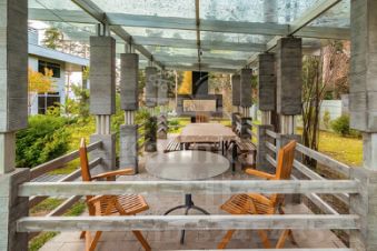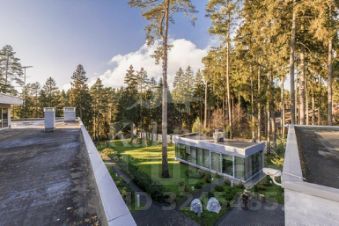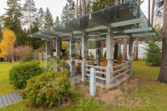 На территории участка расположены банный комплекс с 2-х комнатной квартирой для гостей, дом для персонала и зимнюю беседку-барбекю для уютных семейных вечеров, гараж на 2 м/м, крытый паркинг на 3 м/м, открытая парковка на 3 м/м, выход на озеро.