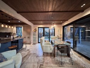 1-ый этаж: спальня, кабинет, кухня-столовая-гостиная (76,5 кв.м), прихожая, 2 с/у, котельная (Vaillant). По всему 1-му этажу проложен водяной теплый пол (натуральный дуб; с/у и прихожая - керамогранит). Итальянский кухонный гарнитур премиум-сегмента ArredoTre. Встроенная техника: SMAG и AEG. Сантехника: Villeroy&boch, Kludi, Porcelanosa. Мебель европейских производителей. Домашний кинотеатр с премиальной акустикой Martin Logan.