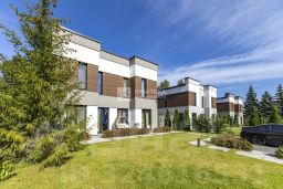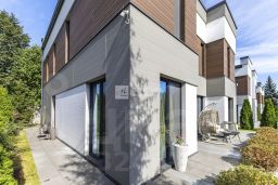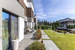 Вокруг дома небольшая зеленая лужайка, мощеная зона отдыха и зона барбекю, имеется достаточно места для парковки гостевых автомобилей. Можно разместить детский игровой комплекс, качели, садовую мебель для летних завтраков и ужинов на свежем воздухе. Для увлеченных ландшафтным дизайном масса возможностей для украшения придомовой территории растениями в кашпо. По периметру высажены хвойные деревья и лиственные кустарники.