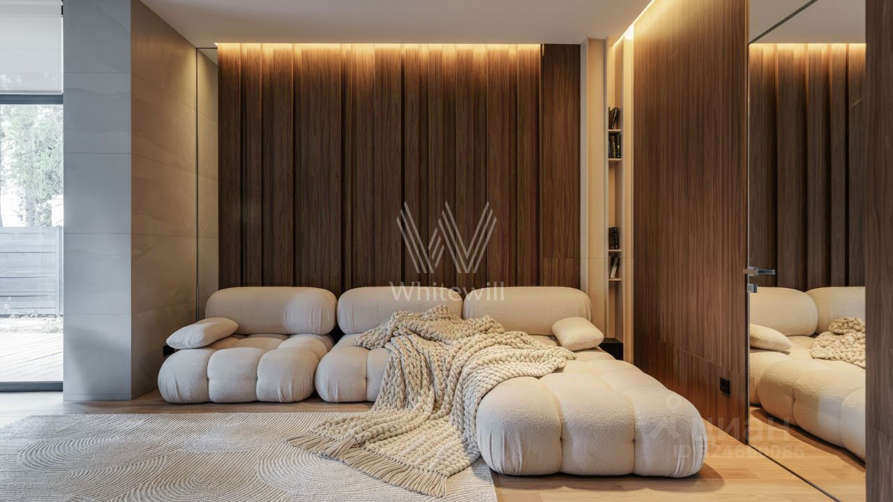 НИИ Радио. Новый загородный коттедж площадью 216 м² расположен на живописном лесном участке 12,5 соток. Современный фасад с эффектной подсветкой облицован крупноформатным керамогранитом и ригельным камнем в контрастных оттенках, а также обрамлён просторными террасами из натуральной лиственницы. Панорамные окна открывают захватывающие виды на природное окружение и наполняют внутренние пространства солнечными лучами, а высокие потолки придают ощущение лёгкости.