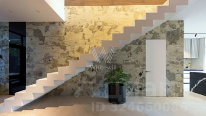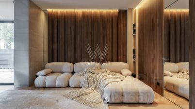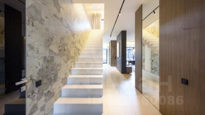 Интерьеры выполнены в светлых тонах с акцентом на натуральные фактуры, укомплектованы встроенной бытовой техникой и стильной мебелью, изготовленной на заказ. Различные сценарии освещения позволяют легко менять атмосферу в зависимости от времени суток и настроения. Для идеального микроклимата установлена система кондиционирования и уложен водяной "тёплый пол".