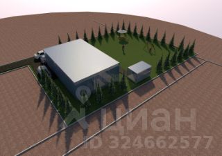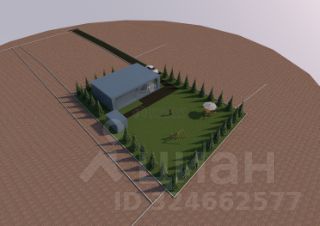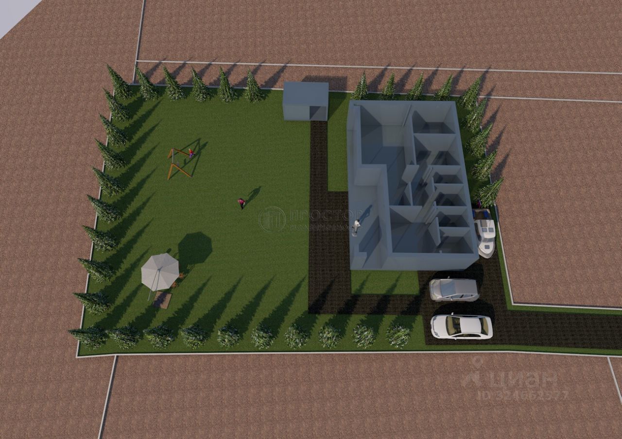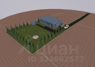 В качестве примера на участке размещён одноэтажный дом от ведущего домостроительного комбината в функциональном стиле площадью 126 м² с учётом норм проектирования. Видно, что обеденное и вечернее солнце полностью охватывает всю зону отдыха на участке, включая террасу дома, от обеда до самого заката, что очень важно!