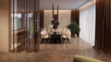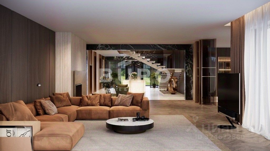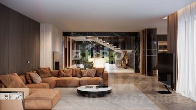 Цоколь: холл, постирочная, кинотеатр, массажная комната с зоной СПА, комната для хранения вина, рабочая кухня с помещением для хранения продуктов, две кладовые комнаты, техническая зона с оборудованием и места для хранения в ней, серверная, помещение свободного назначения (можно под спортзал), блок персонала: 2 спальни, кухня, санузел, холл.