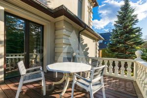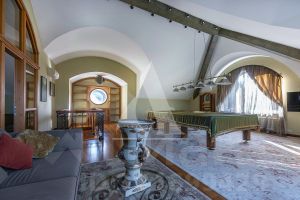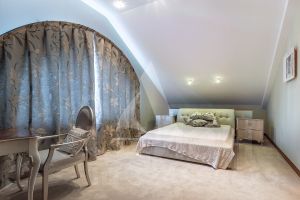 1 этаж: холл, кухня-столовая, гостиная с камином и выходом на террасу, спальня, гостевой с/у, сауна, постирочная, котельная. 2 этаж: три спальни, два с/у, большая гардеробная. Мансарда: кабинет, с/у, зона отдыха с бильярдным столом Гараж: парковка