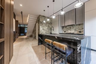 Монолитный каркас, утепление 150 мм, керамогранит и ригельный камень на фасаде