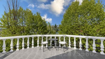 Лызлово. Загородный особняк площадью 1000 м² расположен на полевом участке 17 соток. Фасад, выполненный в европейском стиле, облицован штукатуркой благородного тёмно-серого оттенка и дополнен белоснежной балюстрадой. Большие окна наполняют коттедж солнечным светом.