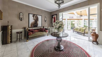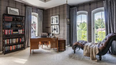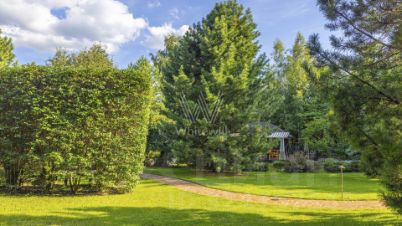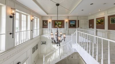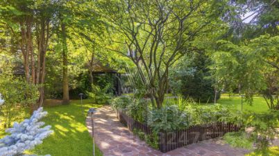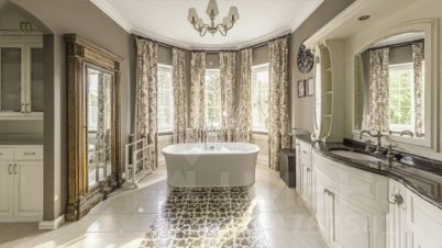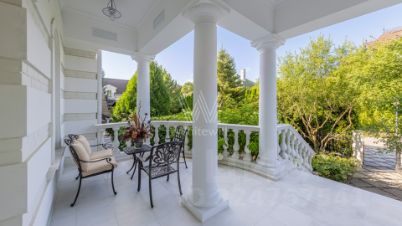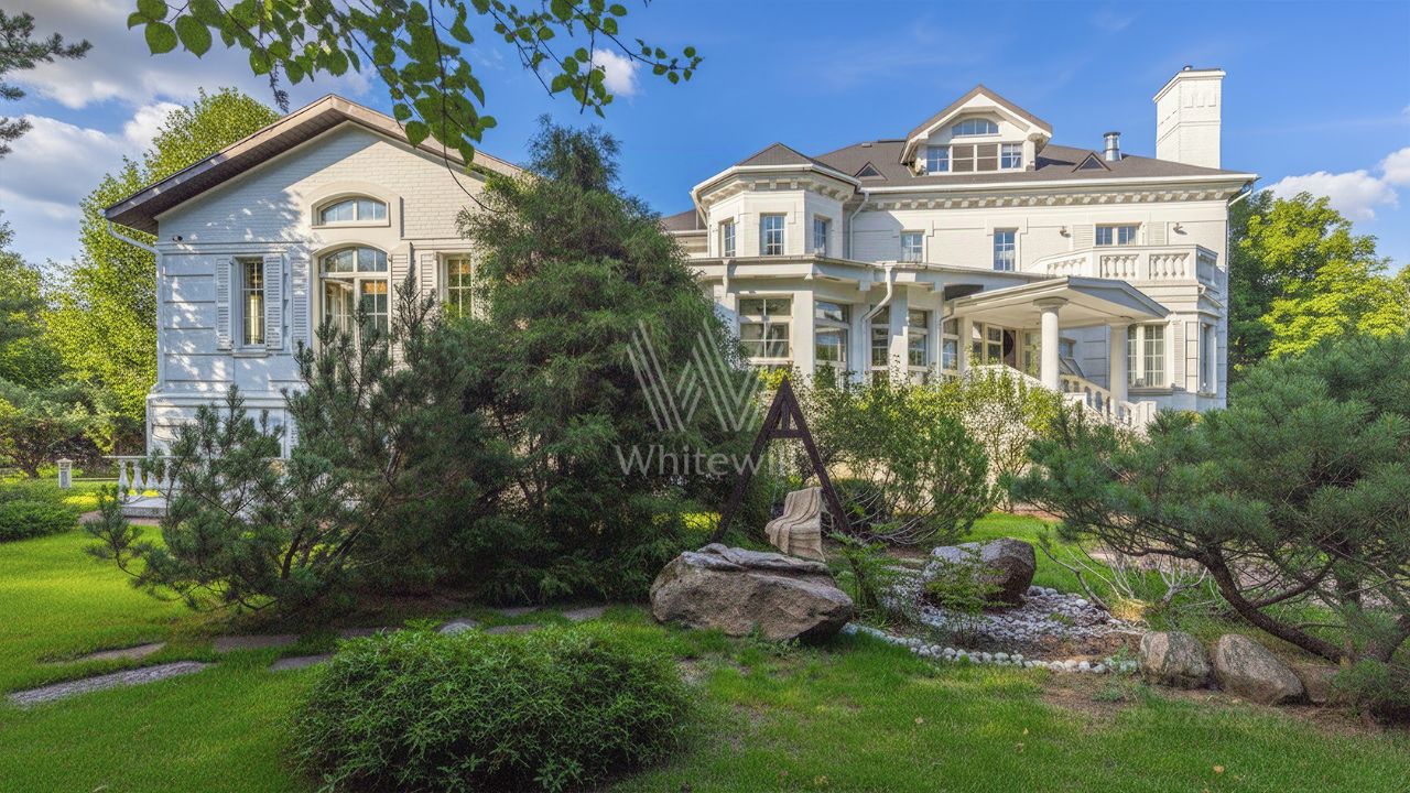 Николино. Загородная резиденция площадью 1245 м² расположена на просторном участке 50 соток. Фасад здания в классическом стиле облицован молочным кликером и декорирован колоннами, балясинами и ставнями. В отделке светлого интерьера преобладают теплые оттенки, создающие атмосферу уюта. Планировкой дома предусмотрены 4 спальни, гостиная с камином, столовая с камином, рабочая с выходом в гараж и лестницей на цокольный этаж и парадная кухни, кабинет с зоной отдыха, зимний сад, веранда с барной зоной, столом на 12 персон, диванной зоной и отдельным выходом в сад, бильярдная-кинозал и гараж на 2 машины. Расслабиться в конце дня можно в SPA-зоне с хаммамом и бассейном с противотоком. Коттедж оборудован пассажирским лифтом для всех уровней. Рядом построен хозяйственный дом 128 м² с комнатой охраны, квартирой для персонала, мастерской и гаражом на 2 машины с навесом. На участке с ландшафтным дизайном обустроен собственный пруд с шестиступенчатой системой очистки воды для купания, на берегу установлены беседка с кухней и санузлом и дека с диванной зоной, зонтом, грилем и лестницей в пруд. Оборудованы баскетбольная и бадминтонная площадки, выделенная территория с грилем для кейтеринга и загон для выгула собак.