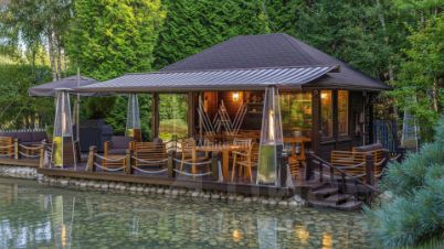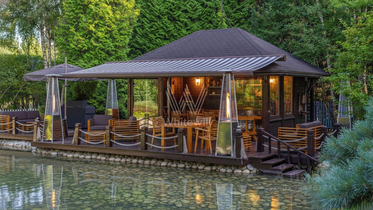 дека между беседкой и прудом с диванной зоной, зонтом, грилем и лестницей в пруд