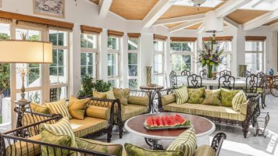 веранда с барной зоной, столом на двенадцать персон, диванной зоной и отдельным выходом в сад