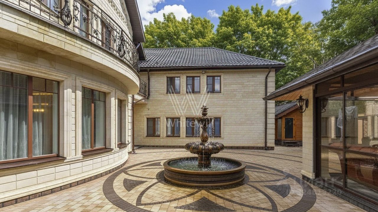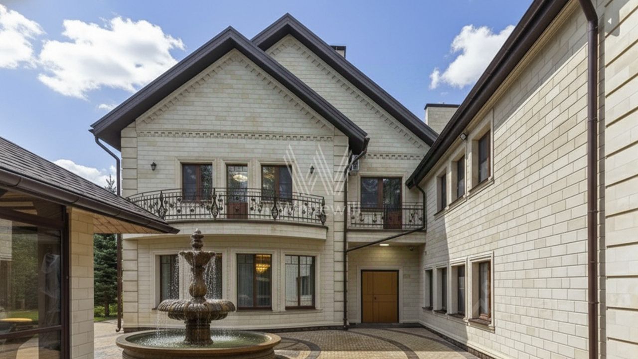 Успенское ТСН. Эксклюзив компании Whitewill. Загородный коттедж площадью 583 м² расположен на участке 16 соток рядом с живописным лесом. Проект дома создан известным архитектурным бюро, и его элегантный неоклассический фасад, облицованный светлым камнем и мрамором, украшают рустовка, монолитные колонны и изящные кованые элементы.