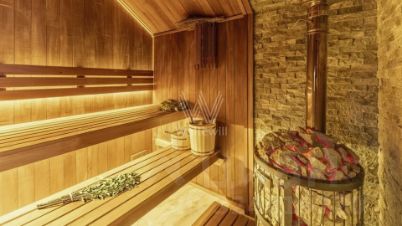 Планировка включает просторную гостиную с дровяным камином, кухню-столовую с выходом в сад, три уютные спальни, вместительные гардеробные и игровую, которую можно переоборудовать под кинозал или бильярдную. Сердцем коттеджа стала спа-зона с бассейном 5х8 метров, хаммамом и комнатой отдыха. Для автомобилей предусмотрено несколько вариантов: удобный встроенный двухместный гараж с квартирой для персонала, а также отдельностоящий гараж с мастерской и кладовой.