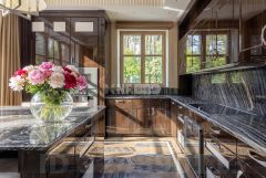 Архитектура дома выполнена в стиле современной американской классики, где каждая деталь подчеркивает элегантность и функциональность. Использование натуральных материалов, таких как камень и дерево, в сочетании с панорамным остеклением, позволяет дому органично вписываться в окружающий ландшафт. Просторные комнаты с отделкой и мебелью создают ощущение легкости и свободы, а наличие бани добавляет особый шарм и комфорт.