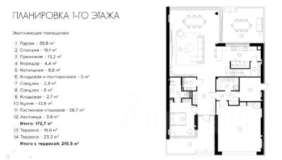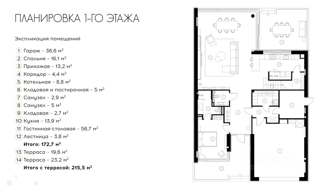 Первый этаж: холл, гостиная с выходом на террасу, кухня с поварской кладовой, гостевой санузел, постирочная, спальня с санузлом или кабинет с выходом на террасу, котельная, гараж на два машиноместа.