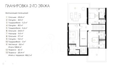 Второй этаж: три автономные спальни с санузлами и гардеробными, видовыми террасами.