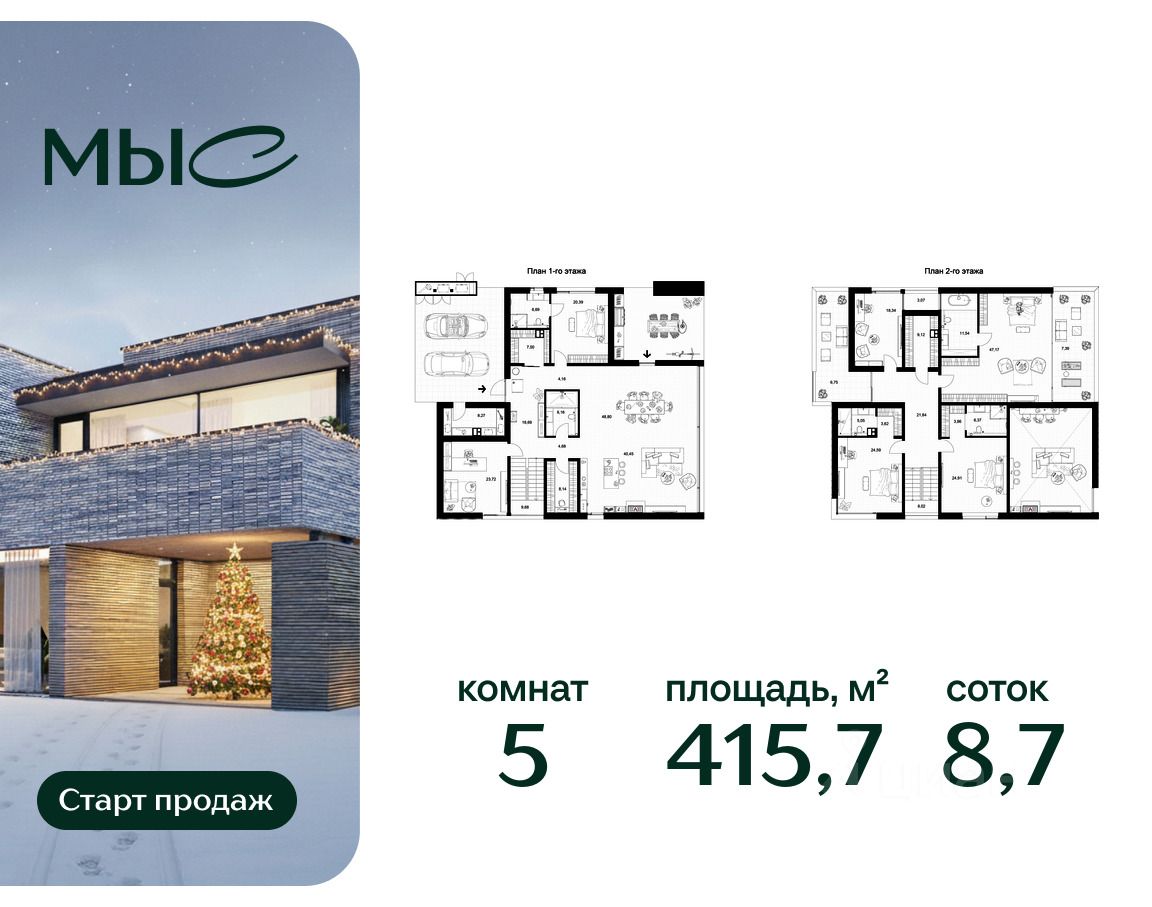 Прямая продажа от застройщика MR. Цена указана с учетом скидки 15%. Продаётся загородный коттедж общей площадью 415.70 м² без отделки в семейном природном кластере премиум-класса МЫС. Срок сдачи: III кв. 2028. Проект МЫС — это, прежде всего, идеальное место для семей. В рамках проекта построят государственную школу, два детских сада и дворец спорта площадью 20 000 м2 с термальным комплексом, выплывным бассейном, фитнес-залом, теннисными, сквош и падел кортами и секциями для детей. На территории площадью, сравнимой с тремя парками Зарядье, появятся кафе и рестораны, пруд с набережной, спортивные и детские площадки, скейт-парк, лыжные и веломаршруты. Расположение: - 2 минуты до скоростной трассы М1 и Минского шоссе; - 10 минут до МКАД; - 15 минут до МЦД Лесной Городок - 20 минут до делового центра "Москва-Сити"; - 28 минут до аэропорта "Внуково". Благоустройство: - велосипедные и лыжные маршруты; - собственная набережная и парк; - лаунж-зоны в окружении природы; - беседки у очага; - дворец спорта площадью 20 000 м²; - термальный комплекс с тремя бассейнами; - 4 теннисных и падел-корта; - 6 сквош-кортов; - многофункциональный спортзал; - скейт-парк; - просторная площадь для прогулок с фонтаном; - детский клуб с творческими секциями; - гастро-доминанта; - кафе у пруда, рестораны, ритейл. Окружение - соседство с лесным фондом; - школа на 1250 мест и 2 детских сада на 350 и 255 мест; - Дубковский и Подушкинский леса, парк "Рассказовка", Мещерский парк. Действуют специальные условия при 100% оплате, подробности уточняйте у менеджера в офисе продаж.
