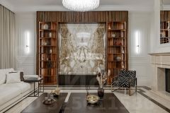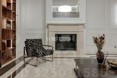 Дом представляет собой великолепный пример современной архитектуры с кирпичными стенами и монолитными перекрытиями. Фасады выполнены из натурального камня, а деревянные панорамные окна из лиственницы добавляют интерьеру естественного света и уюта.