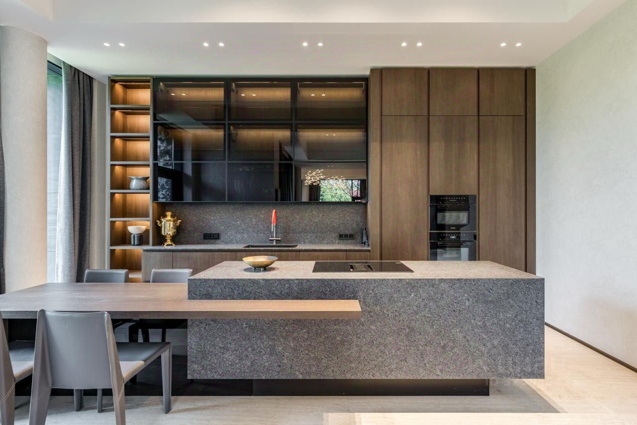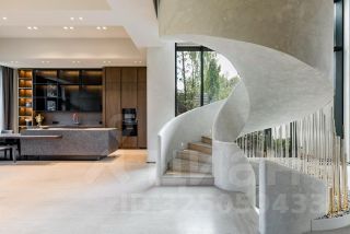 Дом с высокими потолками, панорамными окнами и атриумом 7,5 м. Внутри: 4 спальни с ванными и гардеробными, гостиная-столовая с кухней, кабинет, хобби-комната 50 м² и двухуровневая спа-зона с хаммамом, сауной и джакузи. Также предусмотрен блок персонала с профессиональной кухней и гараж на 2 машины с зарядкой для электромобиля.