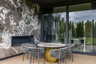 Особенности дома: высокие потолки до 4,2 м, атриум 7,5 м, панорамные окна из закаленного стекла, террасы с барбекю-зоной и автополивом, лифт, натуральные отделочные материалы, декоративная штукатурка и современная инженерия с индивидуальным управлением отопления и климата.