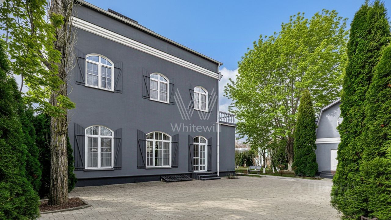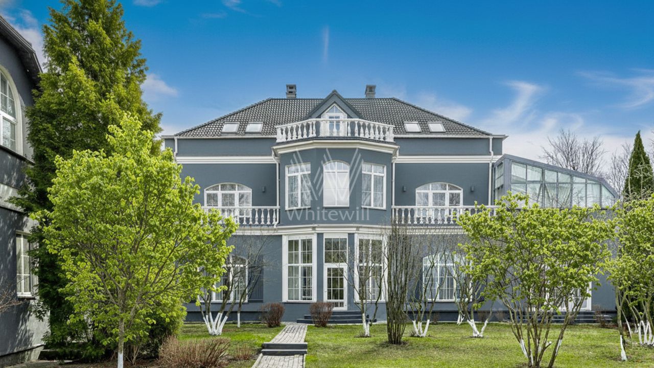 Лызлово. Загородный особняк площадью 1000 м² расположен на полевом участке 17 соток. Фасад, выполненный в европейском стиле, облицован штукатуркой благородного тёмно-серого оттенка и дополнен белоснежной балюстрадой. Большие окна наполняют коттедж солнечным светом.