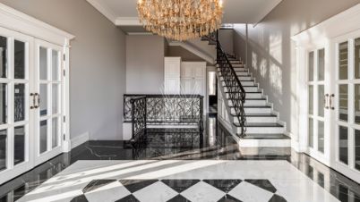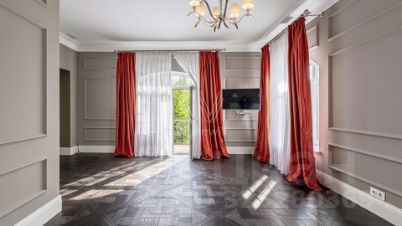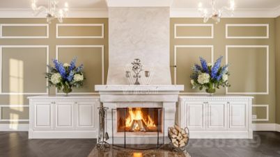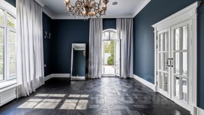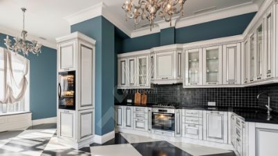 Интерьеры, сочетающие пастельные и глубокие тона, украшены молдингами, обоями с элегантными принтами и изящными люстрами. Отделка выполнена с использованием натуральных материалов. Парадная лестница декорирована фигурной ковкой, а на полу уложен наборный паркет. Дом укомплектован бытовой техникой и сантехникой от ведущих производителей.