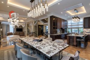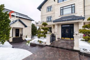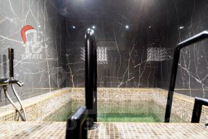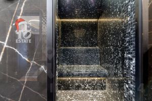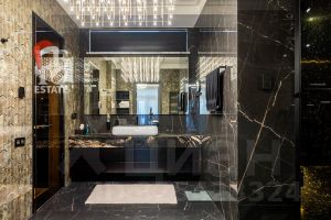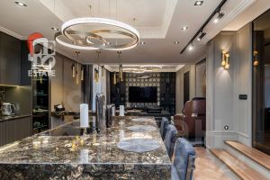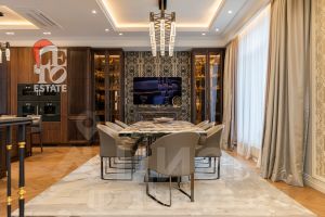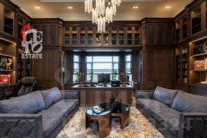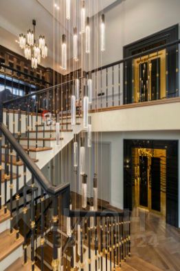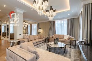 Дом находится на участке площадью 28 соток, у которого есть непосрелственный выход к водоёму. Архитектурный облик здания выдержан в неоклассическом стиле: фасад отделан благородным бежевым камнем и эффектно декорирован, полуколонны придают сооружению величественность, а рустовка добавляет изысканную фактурность поверхности. Внутреннее пространство резиденции продумано до мелочей и сочетает в себе классические традиции и современные дизайнерские решения.