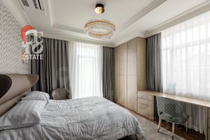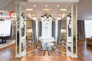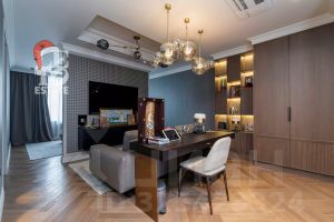 Интерьер построен на тёплой светлой палитре оттенков, что создаёт атмосферу уюта и простора; особую выразительность пространству придают зеркальные поверхности и натуральная деревянная фактура, гармонично вплетённые в общую концепцию дизайна.