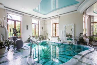 1 этаж: прихожая, 2 гардеробные, 2 санузла, кабинет, гостиная, кухня, столовая, бассейн, душевая, спальня.