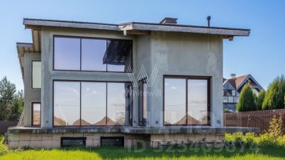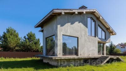 Аксиньино. Загородный дом площадью 395 м² возведен на полевом участке 27 соток. Фасад дома выполнен в современном стиле и выделяется панорамными окнами, выступающими элементами и ассиметричной крышей, которая формирует выразительный силуэт. Свободная планировка позволяет организовать пространство по собственному усмотрению, есть возможность выбрать готовый дизайн-проект.