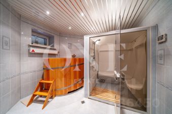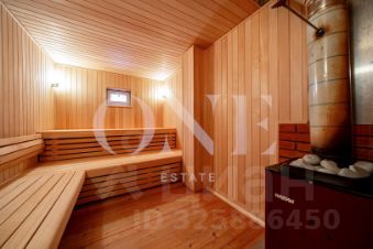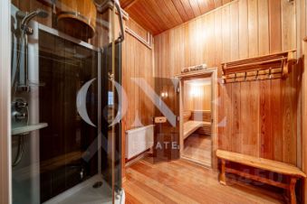 На участке дополнительно построена баня из оцилиндрованного бревна 80 м2 с кухней, камином и гостевой комнатой на втором этаже, уличный бассейн, чайный домик и летняя беседка.