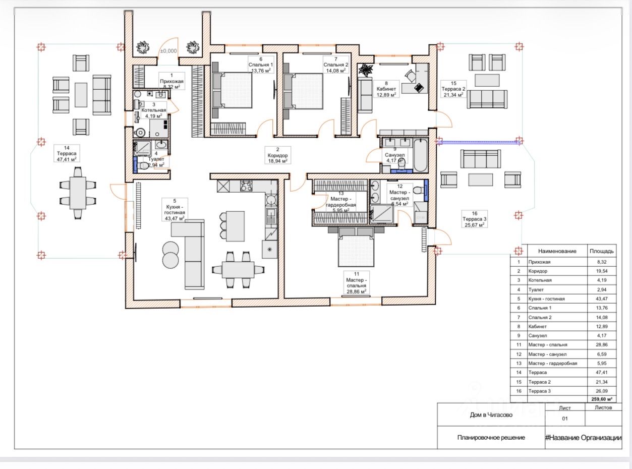 Планировка включает:— прихожую с гардеробной 8,32 м²— просторную кухню-гостиную 43,47 м² с выходом на террасу 47,41 м² — гостевой санузел с душевой кабиной 2,94 м²— мастер-спальню 28,86 м² с гардеробной 5,95, м² ,мастер-санузел 6,54 и выход на террасу площадью 25,67 м²— две уютные спальни по 14 м²— кабинет 12,89 с выходом на террасу площадью 21,34 м²— дополнительный санузел с ванной 4,17 м².