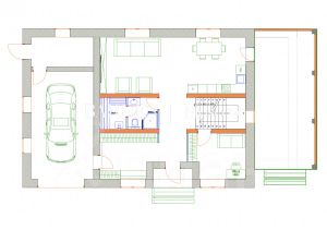 1 этаж: холл, гардеробная, ванная с сауной, кабинет/спальня, объединенная кухня со столовой и выходом на крытую террасу, мягкая зона, гараж на 1 м/м с антресолью
