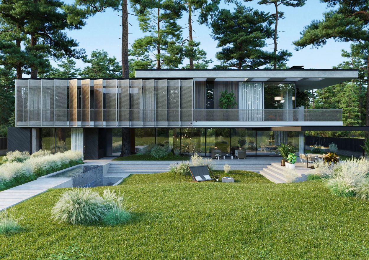 Архитектура в стиле современного минимализма подчёркивает статус владельцев, при этом дом остаётся максимально функциональным и не требует сложного ухода.