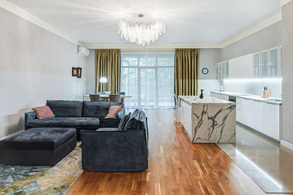 Предлагается в аренду просторная 2-х комнатная квартира в доме премиум класса с охраной. Квартира площадью 150 кв. м с собственной террасой 30 кв.м и сауной, полностью укомплектована для вашего комфортного проживания всей техникой и итальянской мебелью. Установлены кондиционеры и теплые полы. Просторная кухня совмещена с гостиной, 2 санузла, 2 гардеробные комнаты и большая спальня.