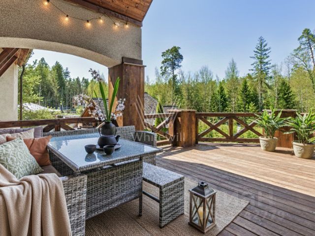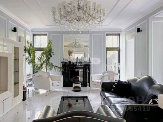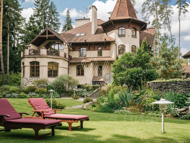 Грибово. Загородный дом площадью 1000 м² расположен на участке 100 соток с вековыми хвойными деревьями. Здание обладает монументальным фасадом, оформленным в духе ренессансного замка. Он украшен башней, высокой скатной крышей, эркерами, деревянными элементами и кованой фигурой дракона. В ночное время экстерьер подчеркивается подсветкой. Внутри выполнен ремонт по индивидуальному дизайн-проекту в японском стиле, который подчеркивается в деталях, декоре и планировке.