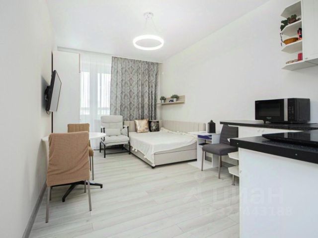 Гостиная: встроенный кухонный гарнитур, холодильник, духовой шкаф, микроволновая печь, варочная плита, посудомоечная машина, чайник, диван, раскладной стол, Smart телевизор