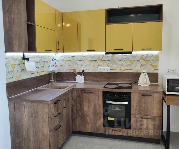Оснащение кухни: индукционная плита, микроволновая печь, вытяжка, холодильник.